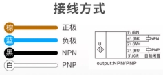 · 我们的传感器为四芯线,棕线、蓝线、黑线、和白线,棕线接正极24v,蓝线接负极0v,黑线负极接NPN(低电平0v输出),白线正极接PNP(高电平24v输出),接线时,黑线白线二选一即可。